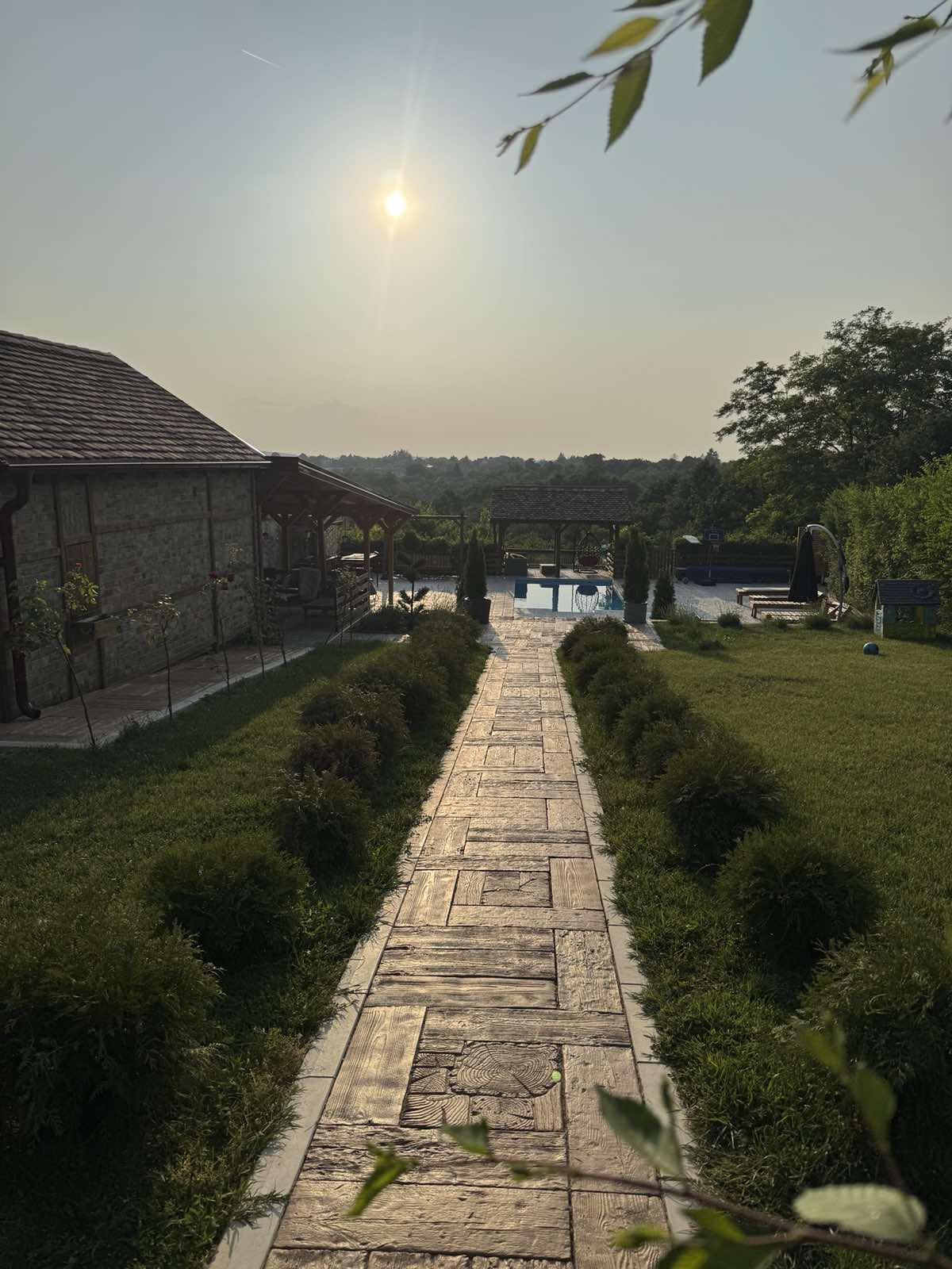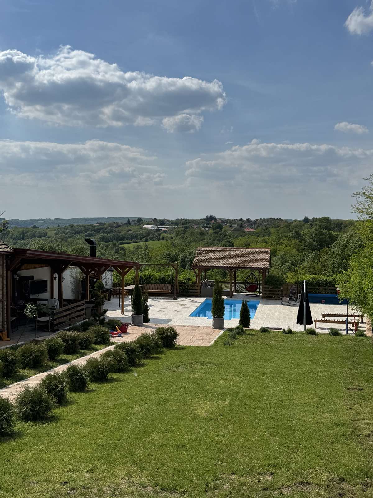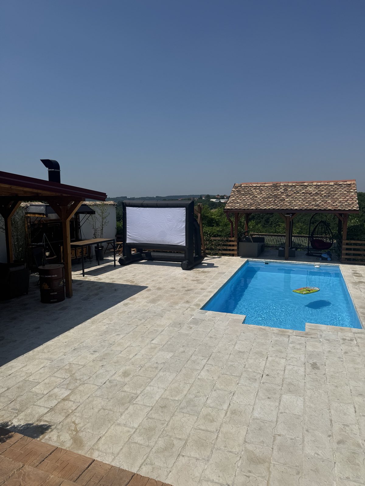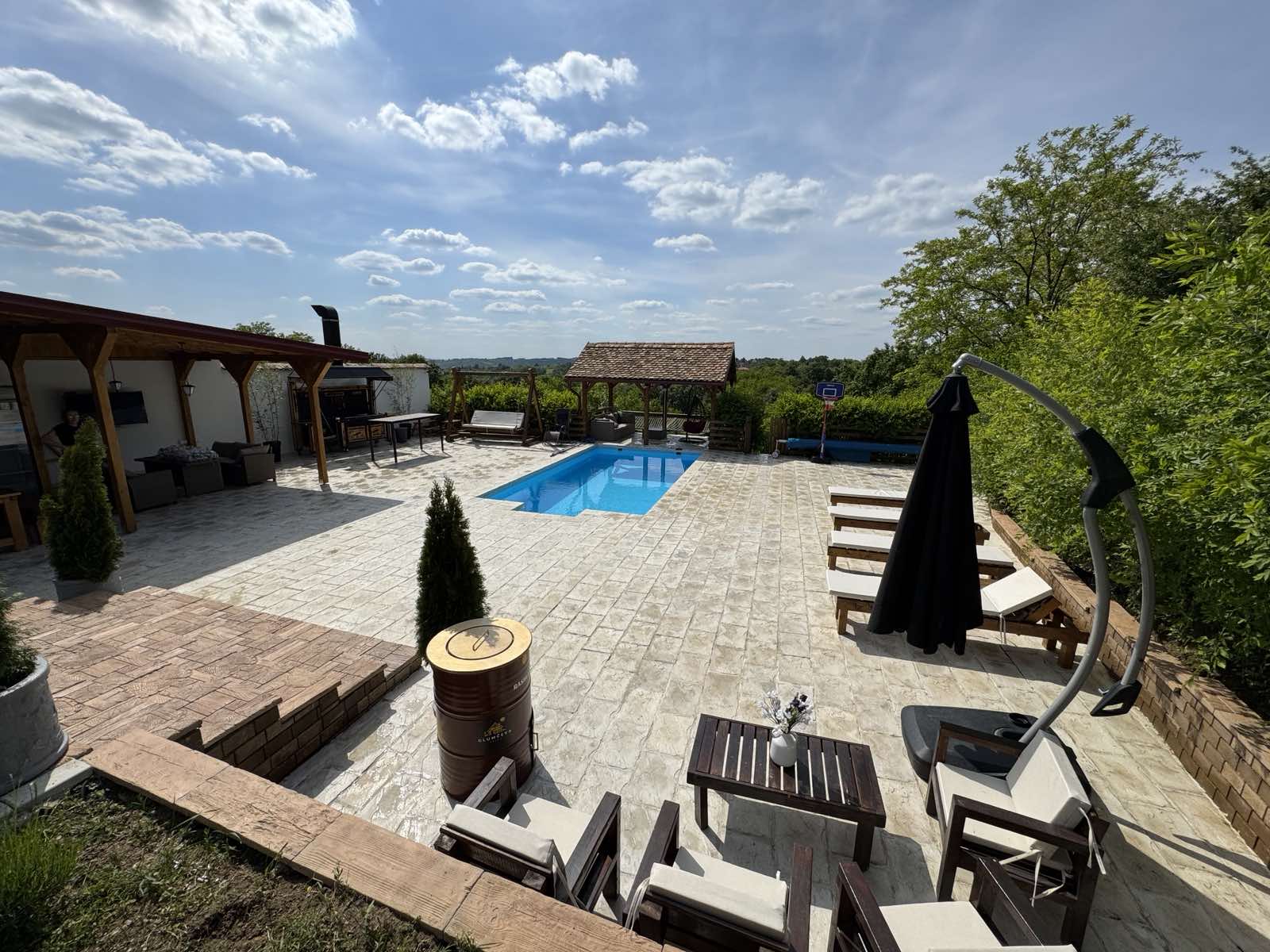 Kada je eksterijer u pitanju, osim pedantnog travnjaka izdvaja se i veliki bazen sa toplotnom pumpom okružen platoom za opuštanje na ležaljkama, ljuljašci i ostalom baštenskom mobilijaru. Tu je i prostorni deo pogodan za okupljanje sa najbližima u uslovima Vaših želja najma. Postoji i velika natkrivena terasa sa kuhinjskim elementom i roštiljskim sadržajem kao i letnjikovac. Gostima je na raspolaganju parking zona za do čak 15 vozila.
