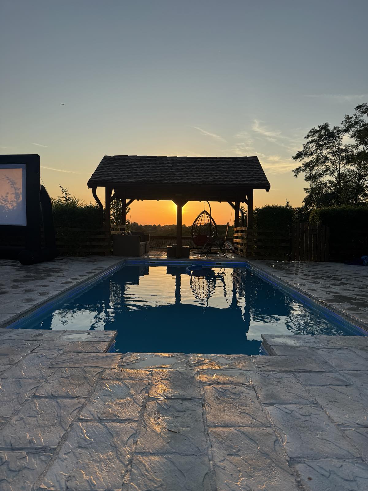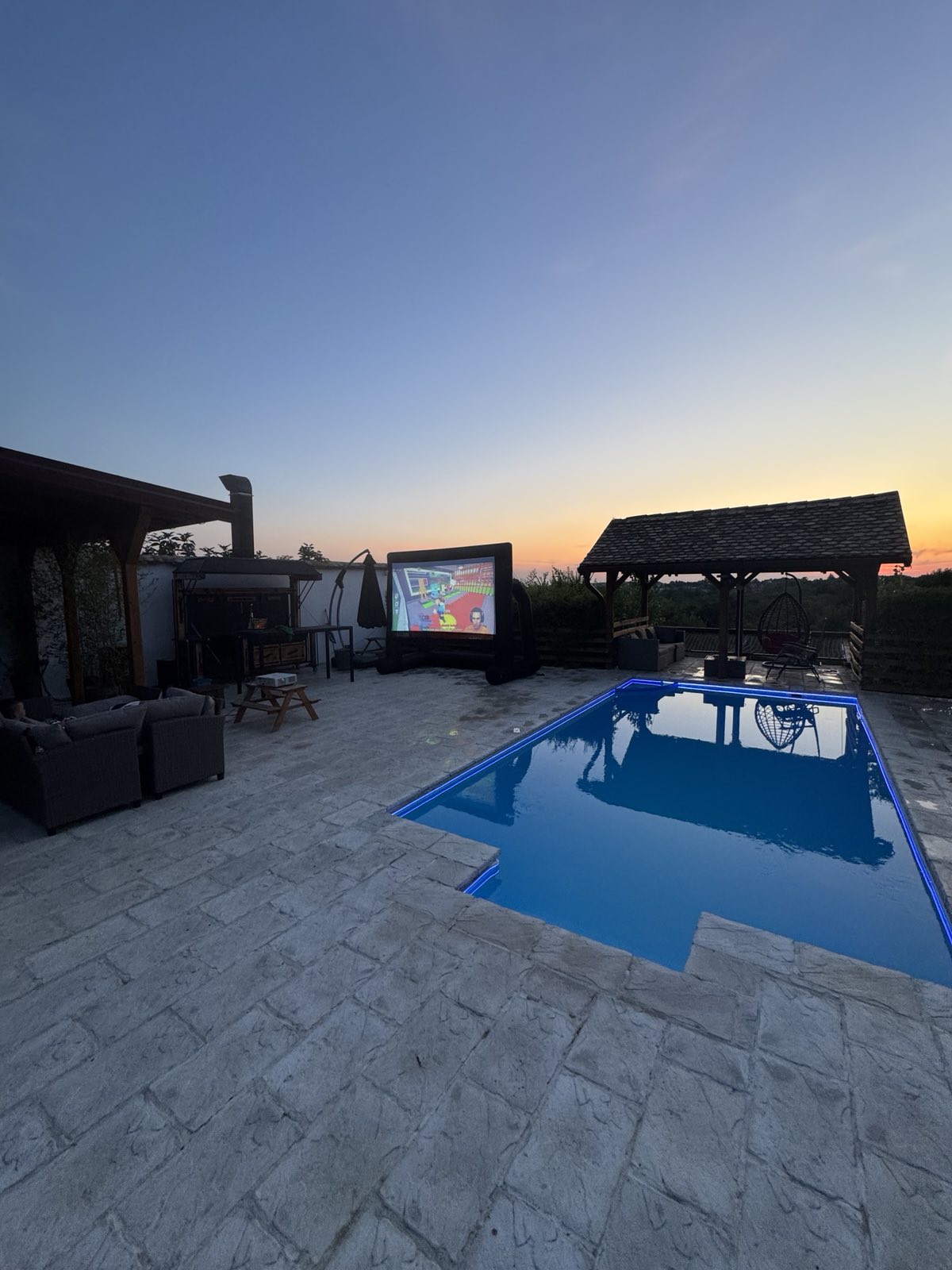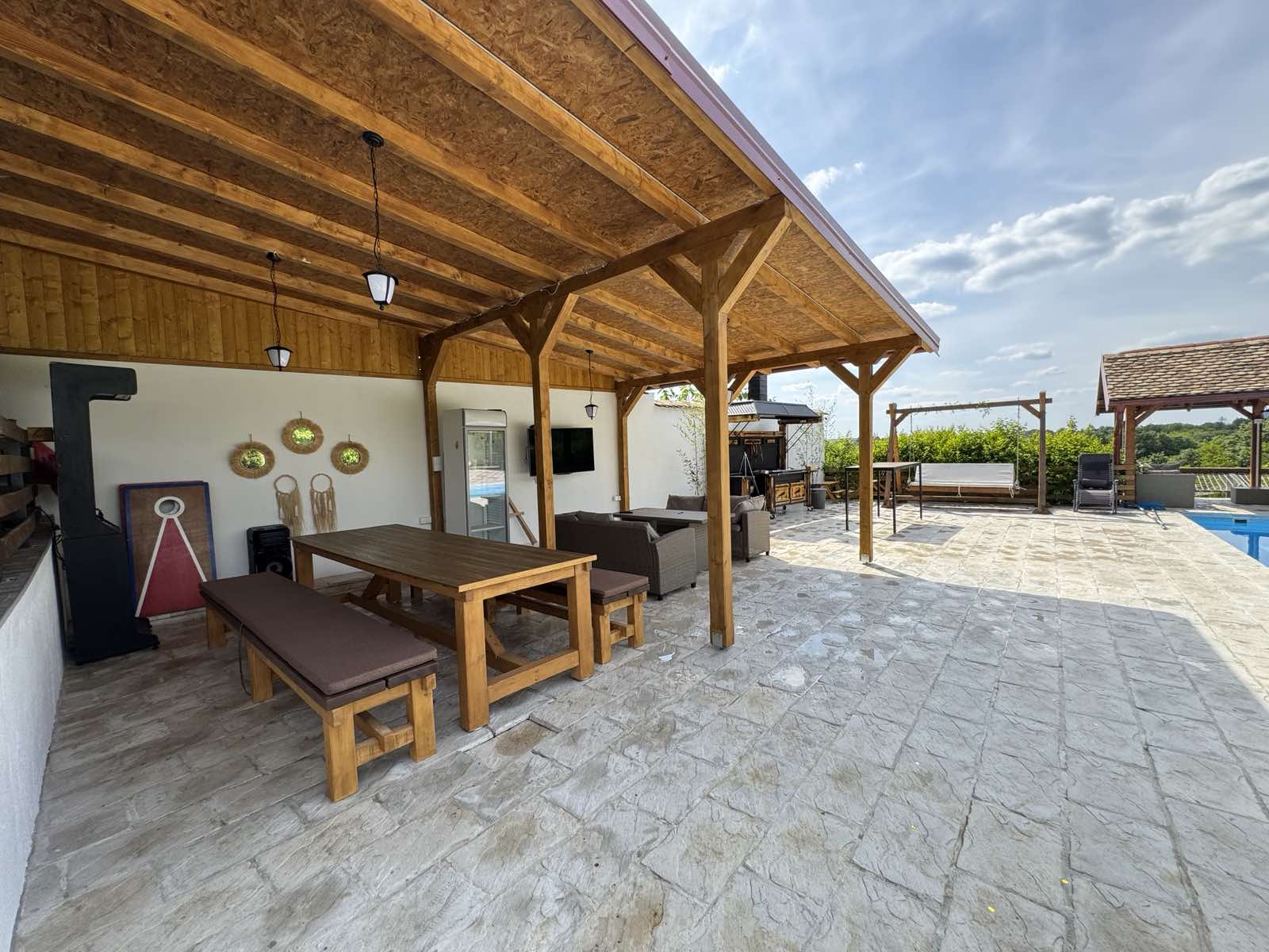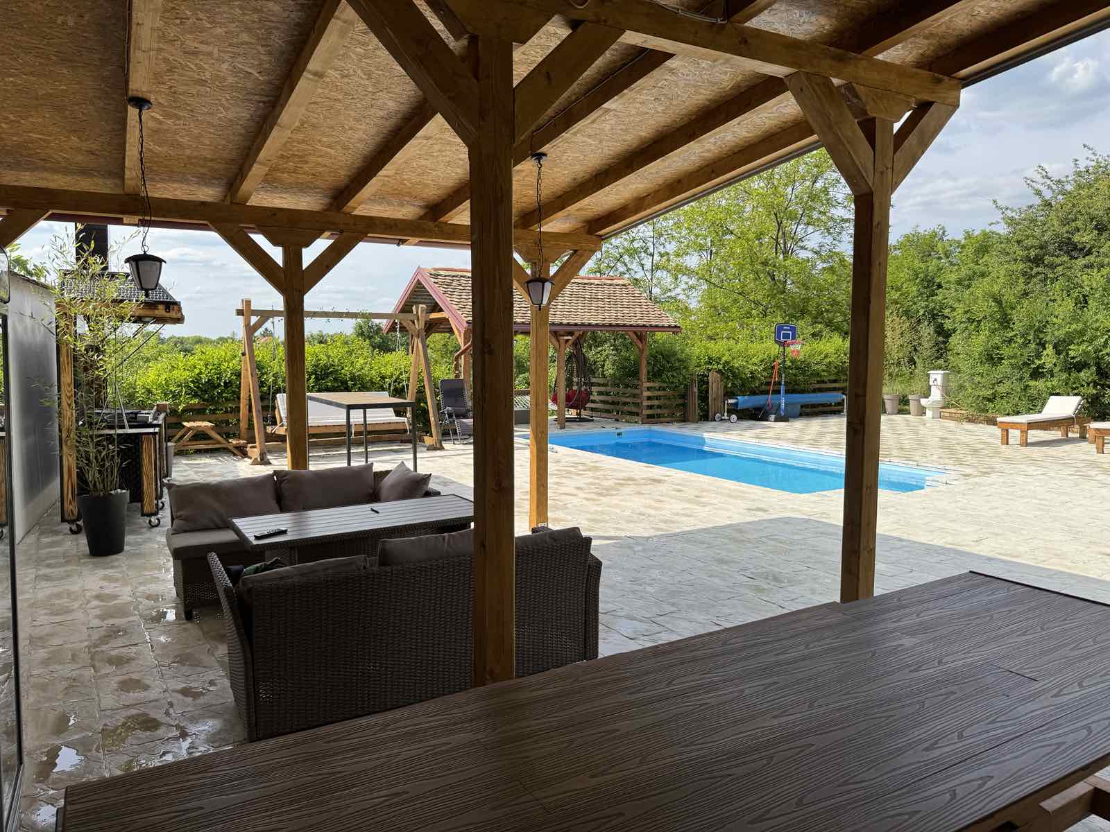 Kada je eksterijer u pitanju, osim pedantnog travnjaka izdvaja se i veliki bazen sa toplotnom pumpom okružen platoom za opuštanje na ležaljkama, ljuljašci i ostalom baštenskom mobilijaru. Tu je i prostorni deo pogodan za okupljanje sa najbližima u uslovima Vaših želja najma. Postoji i velika natkrivena terasa sa kuhinjskim elementom i roštiljskim sadržajem kao i letnjikovac. Gostima je na raspolaganju parking zona za do čak 15 vozila.